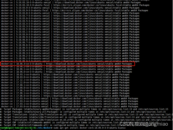 add-apt-repository "deb [arch=amd64] http://mirrors.aliyun.com/docker-ce/linux/ubuntu $(lsb_release -cs) stable"查看可用的docker版本: