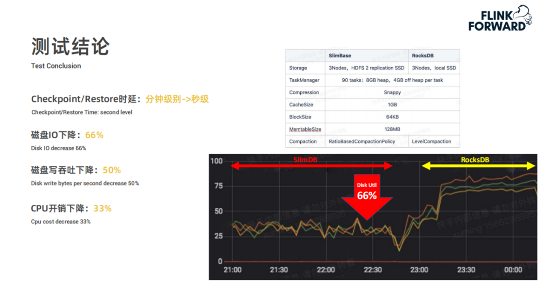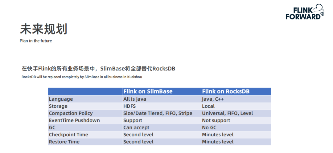 从语言、存储、压缩策略、事件事件下推、垃圾回收、检查点时间、重加载时间七个方面来看,SlimBase 都比 RocksDB 更适合快手实时计算任务的开发,未来的规划是对 Slimbase 的性能做进一步优化,愿景是将快手 Flink 上的所有业务场景全部用 SlimBase 替代掉 RocksDB。