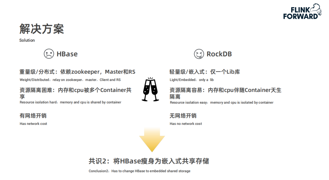 在资源隔离方面,HBase 比较困难,内存和 cpu 被多个 Container 共享;而 RocksDB 比较容易,内存和 cpu 伴随 Container 天生隔离。