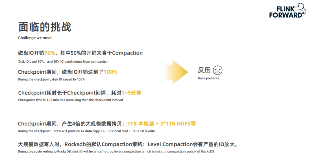首先,在 Checkpoint 期间会产生四倍的大规模数据拷贝,即:从 RocksDB 中全量读取出来然后以三副本形式写入到 HDFS 中;