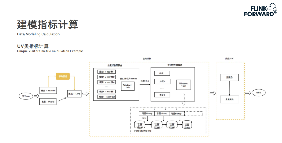 以 UV 类指标计算举例,两个黄色虚线框分别对应两层计算模块:全维计算和降维计算。
