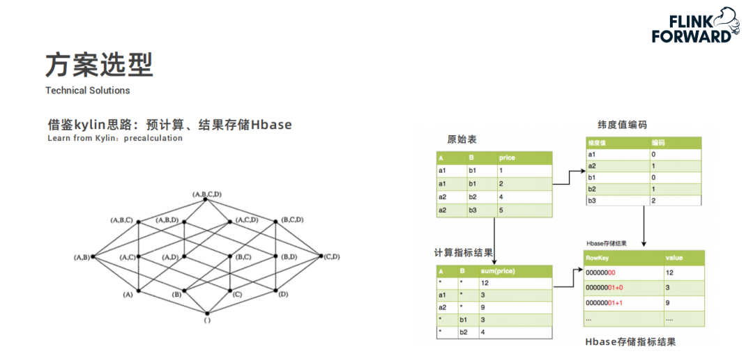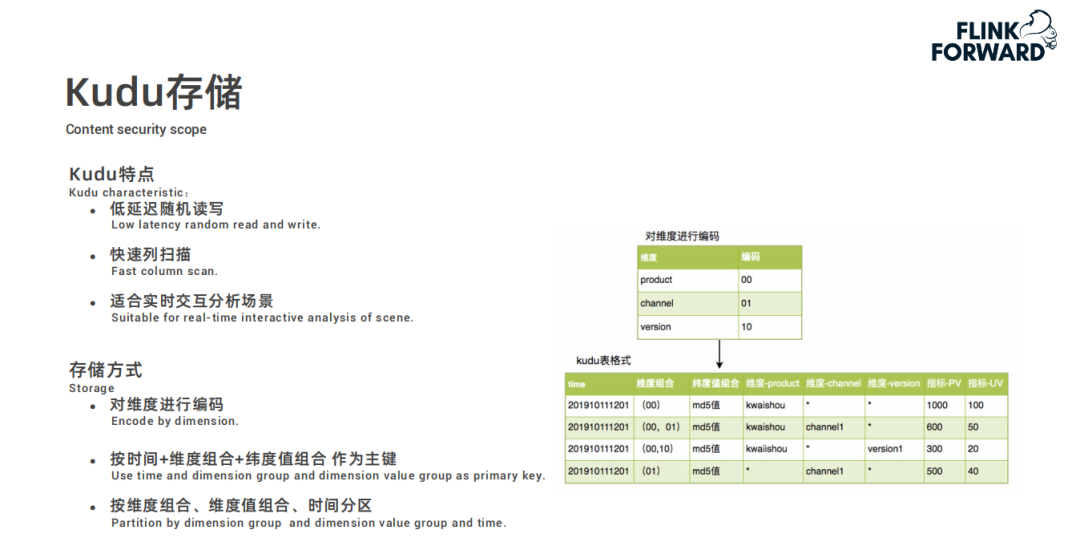 采用 Flink+Kudu 的方案主要思想是借鉴了 Kylin 的思路,Kylin 可以指定很多维度和指标进行离线的预计算然后将预计算结果存储到 Hbase 中;快手的方案是通过 Flink 实时计算指标,再实时地写到 Kudu 里面。