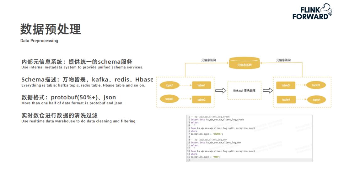 快手 Kafka 的物理数据格式大部分是 Protobuf 和 Json 格式,schema 服务平台也支持将其映射为逻辑表;