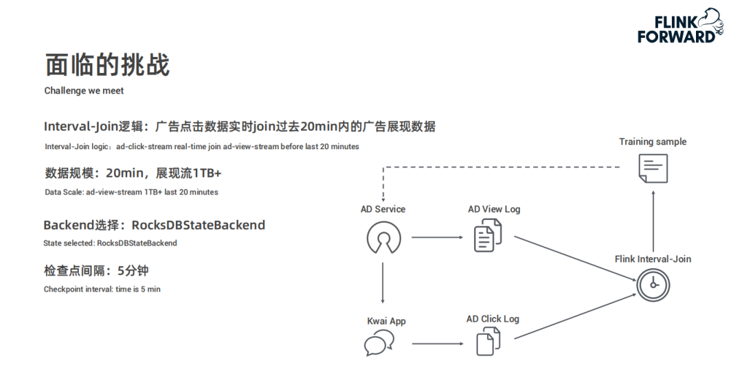 该场景下展现以后20分钟的点击被认为是有效点击,实时 Join 逻辑则是点击数据 Join 过去20分钟内的展现。其中,展现流的数据量相对比较大,20分钟数据在 1TB 以上。检查点设置为五分钟,Backend 选择 RocksDB。