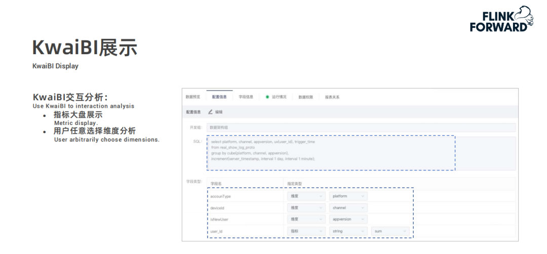 界面为配置 Cube 模型的截图,配置一些列并指定类型,再通过一个 SQL 语句来描述指标计算的逻辑,最终结果也会通过 KwaiBI 展示出来。