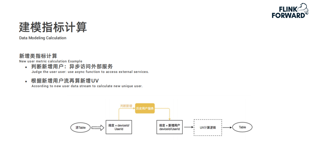 接下来,看新增类的指标计算,和刚刚 UV 的不同点是需要判断是否为新增用户,通过异步地访问外部的历史用户服务进行新增用户判断,再根据新增用户流计算新增 UV,这块计算逻辑和 UV 计算一致。