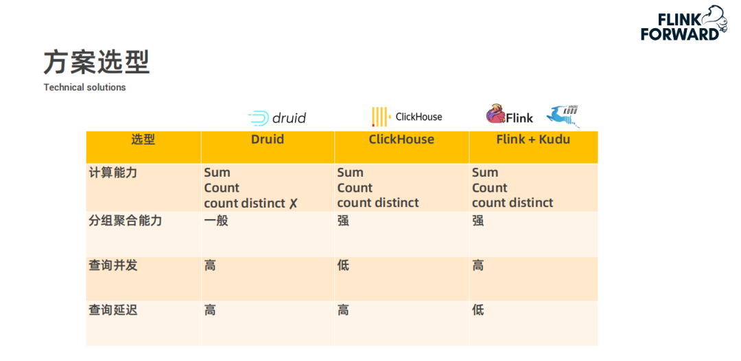 查询并发方面:ClickHouse 的索引比较弱,不能支持较高的查询并发,Druid 和 Flink 都支持较高的并发度,存储系统 Kudu,它也支持强索引以及很高的并发。