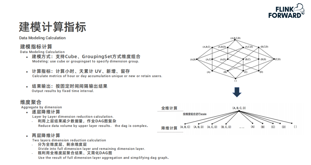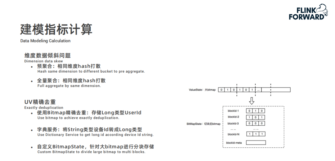 再重点介绍下,建模指标计算中的几个关键点。在建模指标计算中,为了避免维度数据倾斜问题,通过预聚合 ( 相同维度 hash 打散 ) 和全量聚合 ( 相同维度打散后聚合 ) 两种方式来解决。