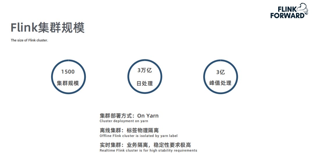 快手目前集群规模有 1500 台左右,日处理条目数总共有3万亿,峰值处理条目数大约是 3亿/s 左右。集群部署都是 On Yarn 模式,实时集群和离线集群混合部署,通过 Yarn 标签进行物理隔离,实时集群是 Flink 专用集群,针对隔离性、稳定性要求极高的业务部署。注:本文所涉及数据仅代表嘉宾分享时的数据。