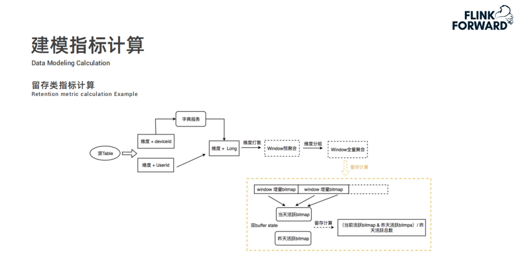 然后,再来看留存类指标计算,与 UV 计算不同的时候,不仅需要当天的数据还需要前一天的历史数据,这样才能计算出留存率,内部实现的时候是采用双 buffer state 存储,在计算的时候将双 buffer 数据相除就可以计算出留存率。