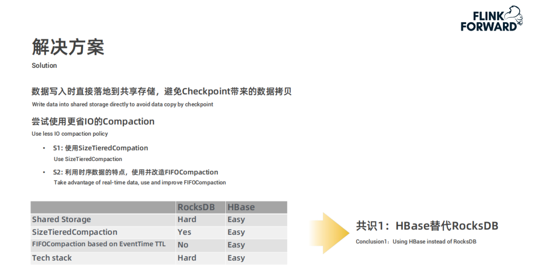 由于出现上文阐述的问题,开始寻找解决方案,整体思路是在数据写入时直接落地到共享存储中,避免 Checkpoint 带来的数据拷贝问题。手段是尝试使用更省 IO 的 Compaction,例如使用 SizeTieredCompation 方式,或者利用时序数据的特点使用并改造 FIFOCompaction。综合比较共享存储、SizeTieredCompation、基于事件时间的 FIFOCompaction 以及技术栈四个方面得出共识:HBase 代替 RocksDB 方案。