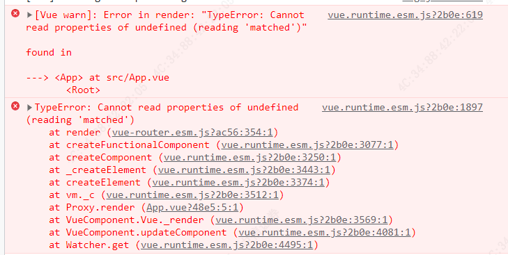 vue.runtime.esm.js?2b0e:619 [Vue warn]: Error in render: "TypeError: Cannot read properties of undefined (reading 'matched')"