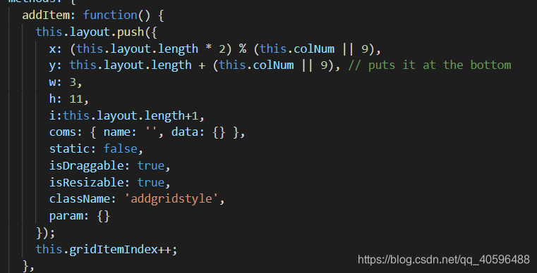 添加的时候加一个动态的样式,目的是添加时给添加的vue-grid-item设置一个背景色或者边框;可以设置一个相对比较显眼的颜色这样你新增的时候用户会感知到新增的框出现在什么位置。等到添加完组件的时候再进行删除;具体代码如下: