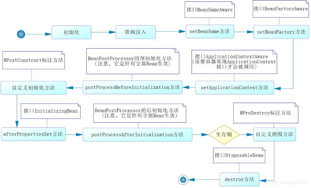 Bean的整个生命周期涉及到多个环节,这些环节之间的关系,如下图所示: