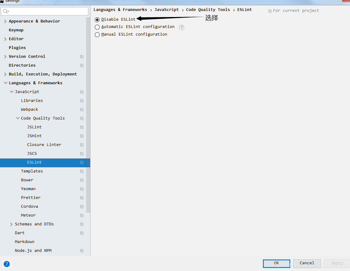File - Settings - Languages - Javascript - Code Quality - ESLint 选择Disable ESLin 保存