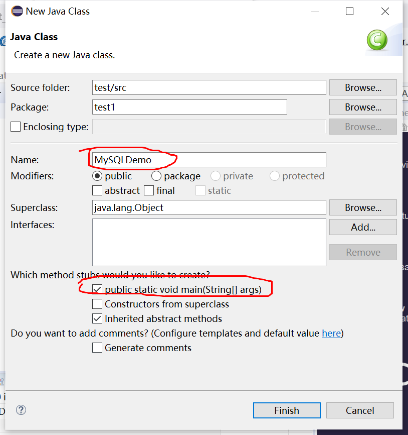 在新建包下新建一个class,取名为MySQLDemo