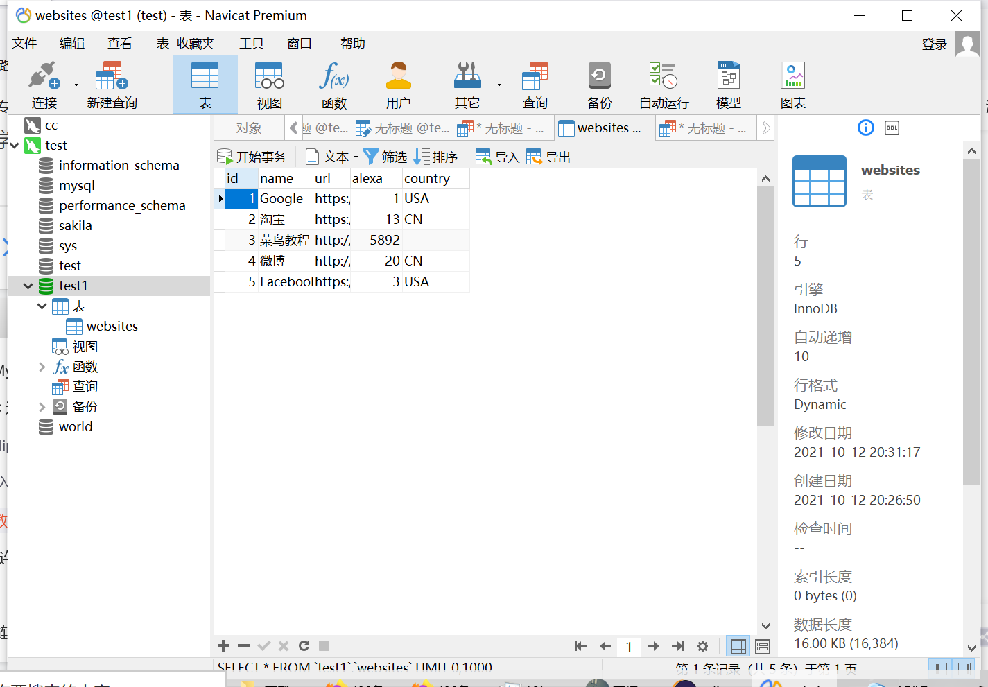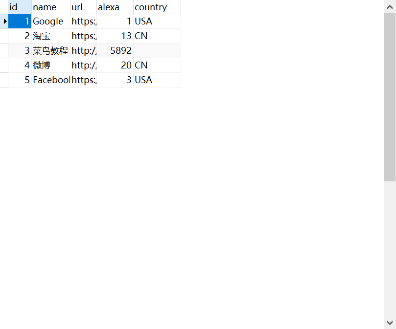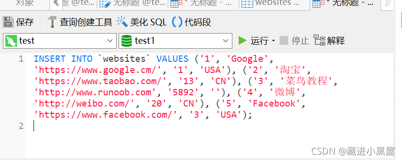 INSERT INTO `websites` VALUES ('1', 'Google', 'https://www.google.cm/', '1', 'USA'), ('2', '淘宝', 'https://www.taobao.com/', '13', 'CN'), ('3', '菜鸟教程', 'http://www.runoob.com', '5892', ''), ('4', '微博', 'http://weibo.com/', '20', 'CN'), ('5', 'Facebook', 'https://www.facebook.com/', '3', 'USA');