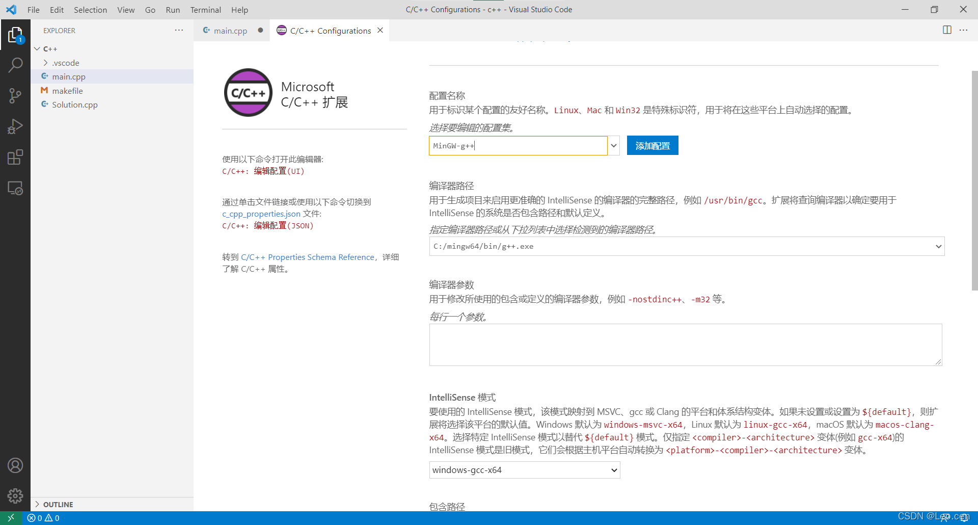 为了更好的辨识性,我将这个配置命名为 MinGW-g++,上述修改也可以在 C/C++ 插件的 .json 配置文件中操作。