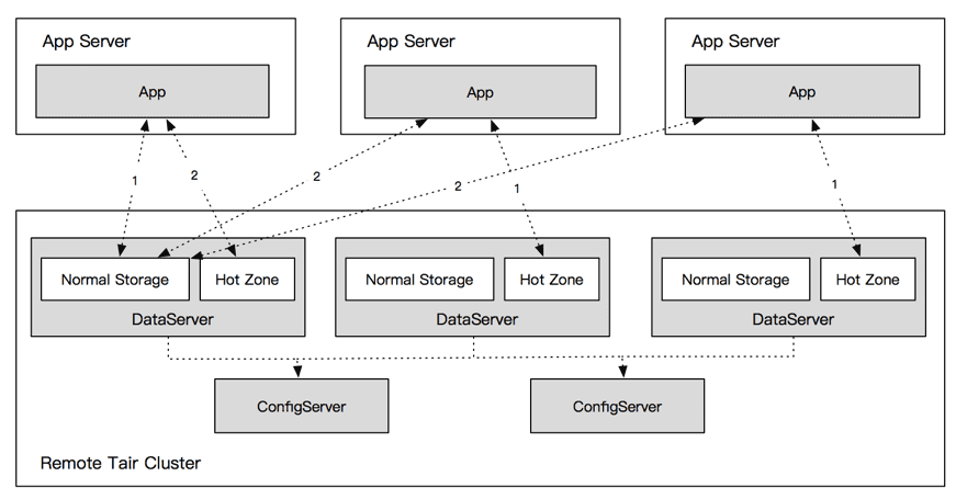 本方案通过在DataServer上划分一块HotZone存储区域的方式来解决热点数据的访问。该区域存储当前产生的所有读热点的数据,由客户端配置的缓存访问逻辑来处理各级缓存的访问。多级缓存架构如下: