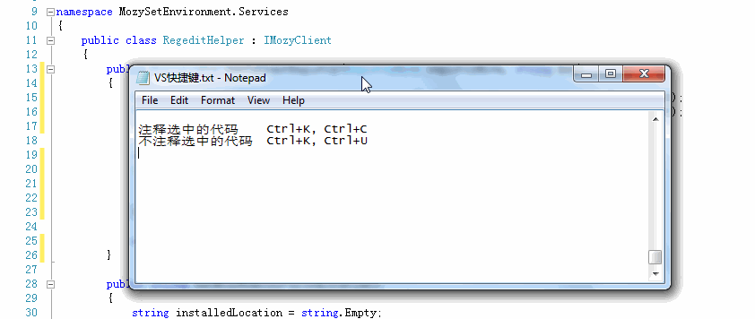 Ctrl+K,U: 取消选定注释内容 (平常注释和反注释 大家相信都用的比较平凡 kernel核心内容 c表示Comment selected text U表示Uncomment selected text)