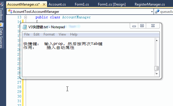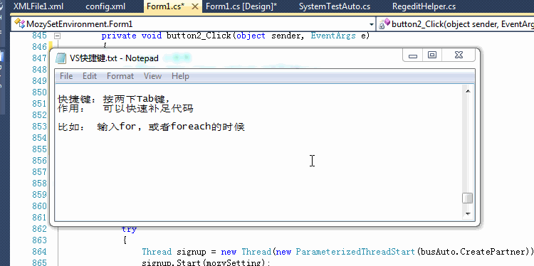 按两下tab快速插入代码段(写for, foreach循环,或者try, 还有绑定事件方法)