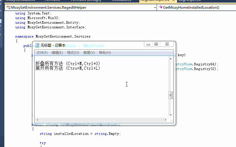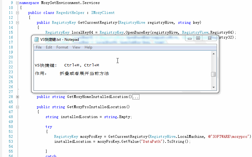 Ctrl+M,P: 停止大纲显示 (用了region将代码折叠起来之后试试用这组组合键吧 体验一下折叠和展开的快感吧 看着舒服的代码我相信你记住这对快捷键肯定是值得的)
