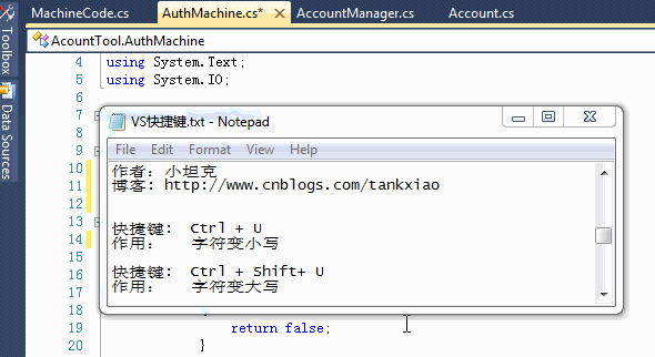 Ctrl+U: 全部变为小写 (个人最喜欢这组快捷键了 因为平常写sql语句的时候都是在sqlserver里面写的 然后再粘贴到vs里来 了解了一些sql语句性能优化的皮毛知识就免不了想把粘贴过来的sql语句全部转换成大写以提高丁点儿性能 )