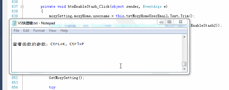 Ctrl+K,P: 参数信息 (kernel核心内容 Parameters参数 如果我们想查看一个方法的具体参数的时候这个组合键可是挺有用的哦)