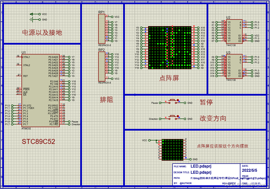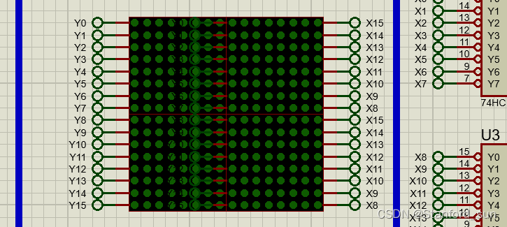 至于关于实现以及16×16更加详细更加完整的介绍,可以去我的这篇文章中看一下:在Proteus中用8×8来实现16×16点阵屏
