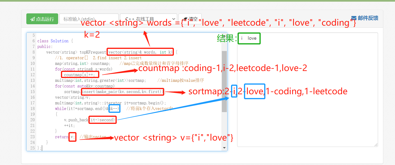 while(it!=sortmap.end()&&k--) //将前k个存入vector中