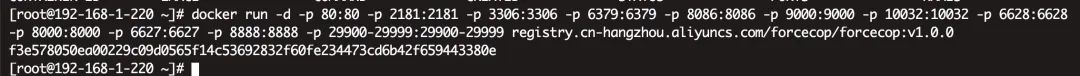 docker run -d -p 80:80 -p 2181:2181 -p 3306:3306 -p 6379:6379 -p 8086:8086 -p 9000:9000 -p 10032:10032 -p 6628:6628 -p 8000:8000 -p 6627:6627 -p 8888:8888 -p 29900-29999:29900-29999 registry.cn-hangzhou.aliyuncs.com/forcecop/forcecop:v1.0.0