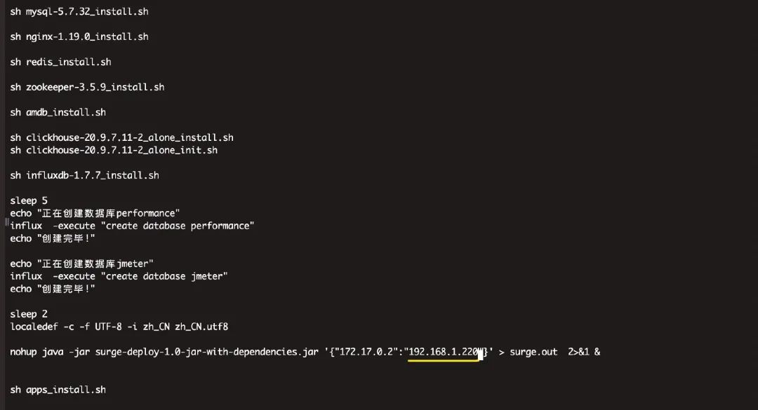 9、更改sugre-deploy的启动命令:vi /data/install.sh,将sugre-deploy的启动命令参数“172.17.0.2”对应的value(192.168.1.138这个)更改为宿主机的IP,保存。