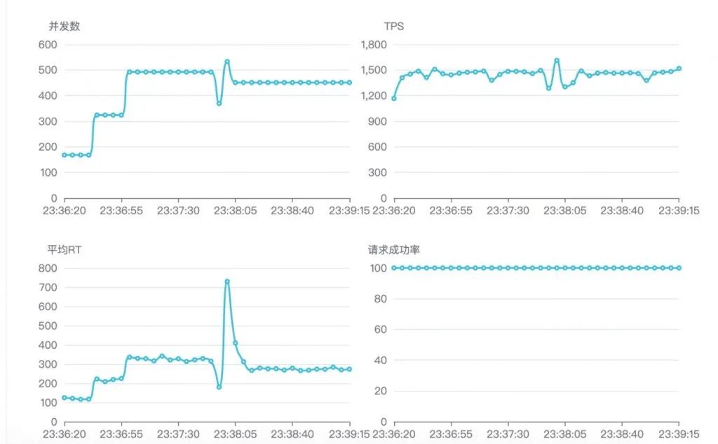 可查看压测全局或单个业务活动的TPS、RT、成功率、SA的指标趋势。