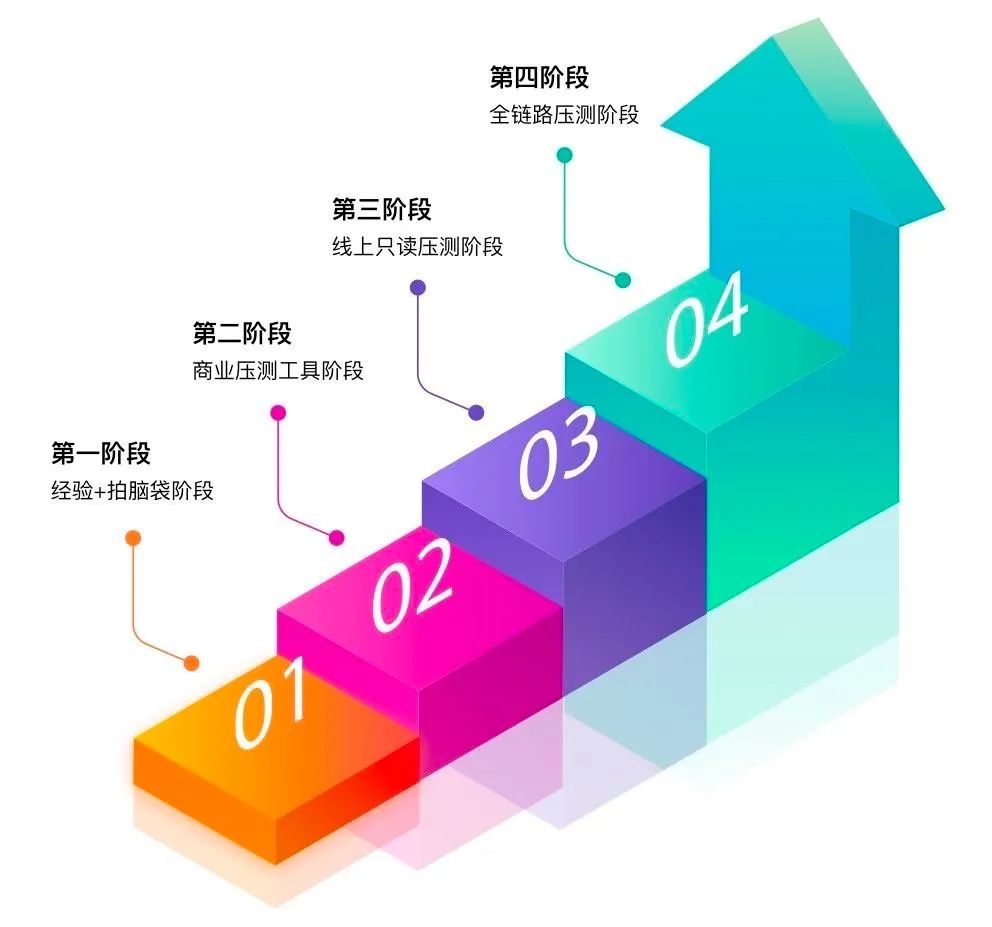 性能测试不同公司的实践程度皆有差异,但整的来说,演进过程主要分为从线下到线上四个阶段: