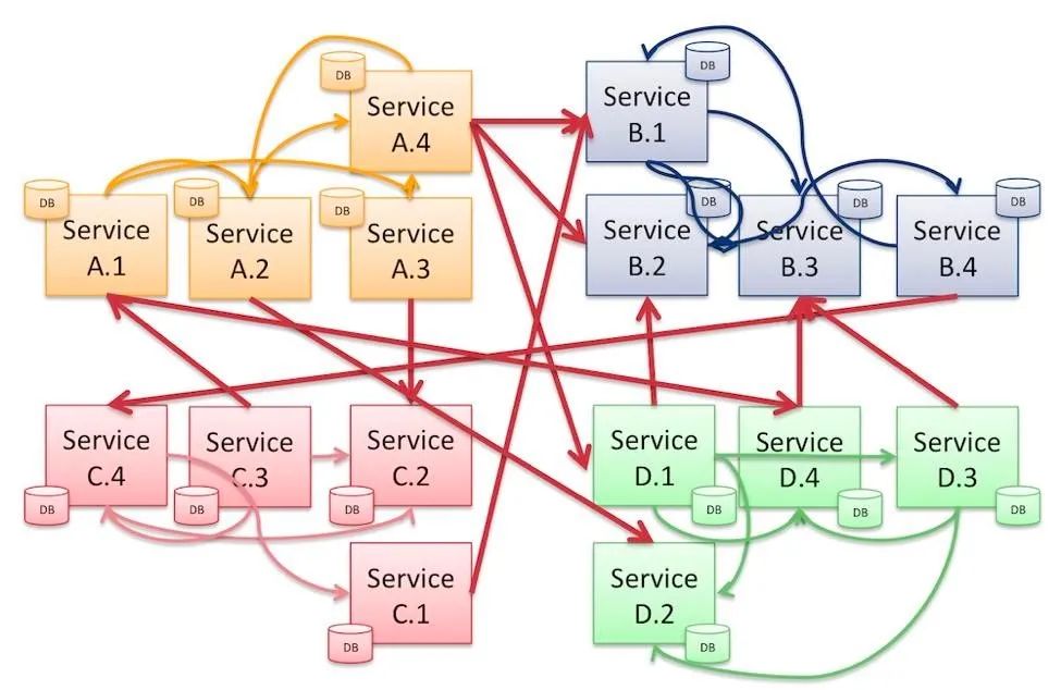 如下这张图中是一张典型微服务调用链路,如果服务数量再扩大几十倍,想象一下,调用关系图又会变成何种样子: