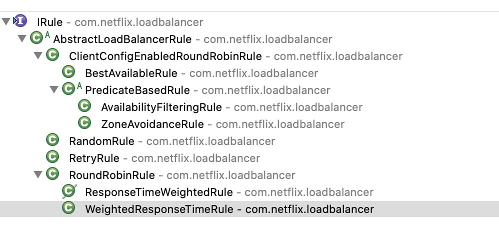 RoundRobinRule:轮询策略;轮询策略下有个加权策略:WeightedResponseTimeRule;另外一个(ResponseTimeWeightedRule)不建议使用了,名字跟WeightedResponseTimeRule差不多,只是单次排列不一样;