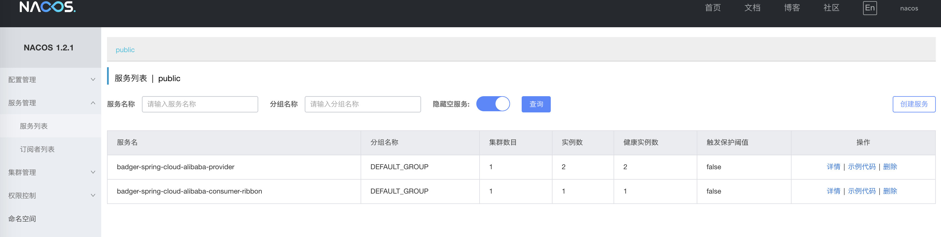 这里为了测试负载均衡,我们使用不同的端口(7000,7001)启动了两份badger-spring-cloud-alibaba-provider应用;通过nacos的页面,也可以看到具体的服务