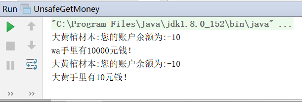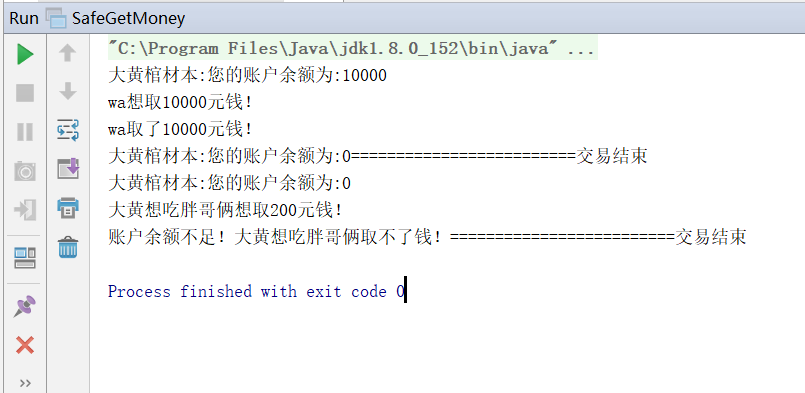 public class SafeGetMoney { public static void main(String[] args) { SafeAccount safeaccount = new SafeAccount(10000, "大黄棺材本"); SafeDrawing me = new SafeDrawing(safeaccount, 10000, "wa"); SafeDrawing DogHuang = new SafeDrawing(safeaccount, 200, "大黄想吃胖哥俩"); me.start(); DogHuang.start(); try { me.join(); } catch (InterruptedException e) { e.printStackTrace(); } } } // 账户 class SafeAccount { // 构造方法 public SafeAccount(int money, String name) { this.money = money; this.name = name; } int money;//余额 String name;//用户名 } // 银行:模拟取款 class SafeDrawing extends Thread { SafeAccount safeaccount;//账户 // 取了多少钱 int drawingMoney; // 手里 现在还有多少钱 int nowMoney; public SafeDrawing(SafeAccount safeaccount, int drawingMoney, String name) { super(name); this.safeaccount = safeaccount; this.drawingMoney = drawingMoney; } @Override public synchronized void run() { // 锁的变化的量 synchronized (safeaccount) { System.out.println(safeaccount.name + ":您的账户余额为:" + safeaccount.money); System.out.println(this.getName() + "想取" + drawingMoney + "元钱!"); // 判断有没有钱 if (safeaccount.money - drawingMoney < 0) { System.out.println("账户余额不足!" + this.getName() + "取不了钱!"+"=========================交易结束"); return; } try { Thread.sleep(1000); } catch (InterruptedException e) { e.printStackTrace(); } // 卡内余额 safeaccount.money = safeaccount.money - drawingMoney; // 手里的钱 nowMoney += drawingMoney; System.out.println(this.getName() + "取了" + this.nowMoney + "元钱!"); System.out.println(safeaccount.name + ":您的账户余额为:" + safeaccount.money+"=========================交易结束"); } } }