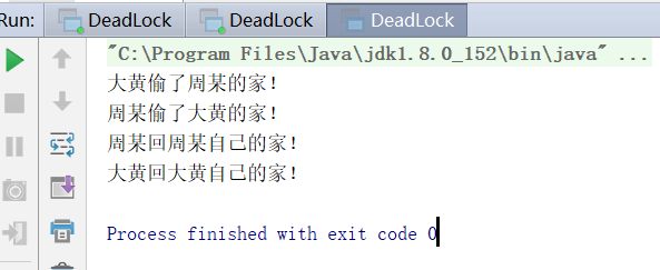 // 死锁----多个线程互相调用对方需要的资源,形成僵持 public class DeadLock { public static void main(String[] args) { Makeup huang = new Makeup("大黄",1); Makeup zhou = new Makeup("周某",0); huang.start(); zhou.start(); } } // dog黄 class DogHuang{ } // pig周 class PigZhou{ } class Makeup extends Thread{ // 需要的资源只有一份,用static来保证 static DogHuang dogHuang = new DogHuang(); static PigZhou pigZhou = new PigZhou(); int choice; String name; public Makeup(String name, int choice) { this.name = name; this.choice = choice; } @Override public void run(){ try { makeup(); } catch (InterruptedException e) { e.printStackTrace(); } } // 互现持有对方的锁,拿到对方的资源 private void makeup() throws InterruptedException { if(choice==0){ synchronized (dogHuang){ // System.out.println(this.name+"偷了大黄的家!"); Thread.sleep(1000); }synchronized (pigZhou){ System.out.println(this.name+"回周某自己的家!"); } }else { synchronized (pigZhou){ System.out.println(this.name+"偷了周某的家!"); Thread.sleep(1000); }synchronized (dogHuang){ System.out.println(this.name+"回大黄自己的家!"); } } } }