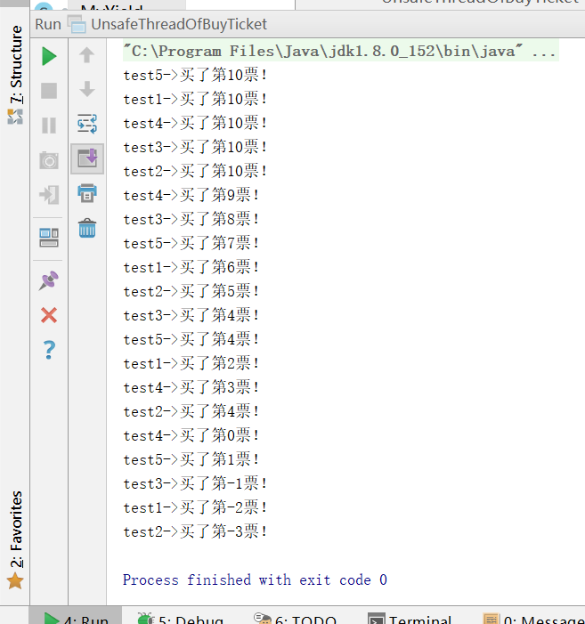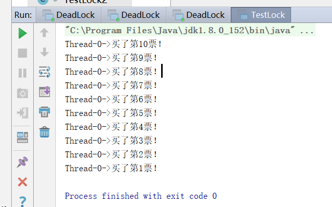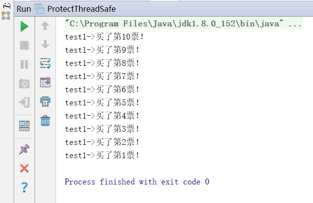 public class ProtectThreadSafe { public static void main(String[] args) { SafeBuyTicket buyTicket = new SafeBuyTicket(); Thread thread1 = new Thread(buyTicket,"test1"); Thread thread2 = new Thread(buyTicket,"test2"); Thread thread3 = new Thread(buyTicket,"test3"); Thread thread4 = new Thread(buyTicket,"test4"); Thread thread5 = new Thread(buyTicket,"test5"); thread1.start(); thread2.start(); thread3.start(); thread4.start(); thread5.start(); } } class SafeBuyTicket implements Runnable{ private Integer ticketNumbers = 10; boolean flag = true; @Override public void run() { while (flag){ buy(); } } public synchronized void buy(){ if (ticketNumbers <= 0){ flag = false; return; } try { Thread.sleep(100); } catch (InterruptedException e) { e.printStackTrace(); } System.out.println(Thread.currentThread().getName()+"->"+"买了第"+ticketNumbers--+"票!"); } }