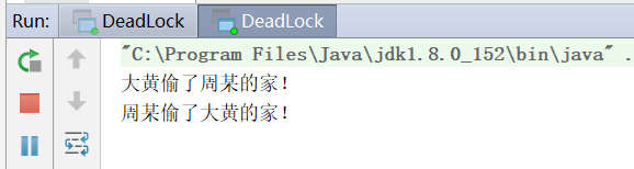 // 死锁----多个线程互相调用对方需要的资源,形成僵持 public class DeadLock { public static void main(String[] args) { Makeup huang = new Makeup("大黄",1); Makeup zhou = new Makeup("周某",0); huang.start(); zhou.start(); } } // dog黄 class DogHuang{ } // pig周 class PigZhou{ } class Makeup extends Thread{ // 需要的资源只有一份,用static来保证 static DogHuang dogHuang = new DogHuang(); static PigZhou pigZhou = new PigZhou(); int choice; String name; public Makeup(String name, int choice) { this.name = name; this.choice = choice; } @Override public void run(){ try { makeup(); } catch (InterruptedException e) { e.printStackTrace(); } } // 互现持有对方的锁,拿到对方的资源 private void makeup() throws InterruptedException { if(choice==0){ synchronized (dogHuang){ // System.out.println(this.name+"偷了大黄的家!"); Thread.sleep(1000); synchronized (pigZhou){ System.out.println(this.getName()+"回周某自己的家!"); } } }else { synchronized (pigZhou){ System.out.println(this.name+"偷了周某的家!"); Thread.sleep(1000); synchronized (dogHuang){ System.out.println(this.getName()+"回大黄自己的家!"); } } } } }