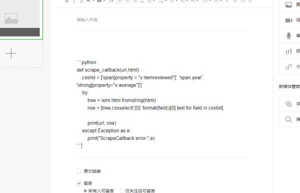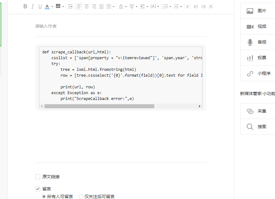自己没事搞了公众号,萌新的学习日记,在编辑的时候,想要加一些Python代码进去,但是微信公众号是这样的啊,没有可以加入代码的地方