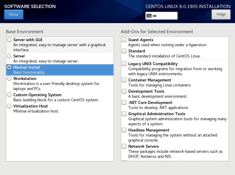 这里根据个人需要选择安装环境,因为虚拟机的原因,我这里选择minimal install