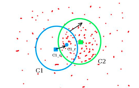 Meanshift算法简单介绍:任意选定的初始迭代点,画一个半径记为H的蓝色圆,将其内所有的点与圆心相连,组成一个向量集,然后对此向量集进行向量相加,相加的结果如黑色向量所示,其终点指向下图所示的蓝色点,则下一次迭代以该蓝色点为圆心,H为半径画圆,然后求这个圆内以圆心为起点所有向量的和。如此迭代下去,圆的中心点为收敛于一个固定的点,也就是概率密度最大的地方。所以 均值漂移算法本质上是一种基于梯度的优化算法。