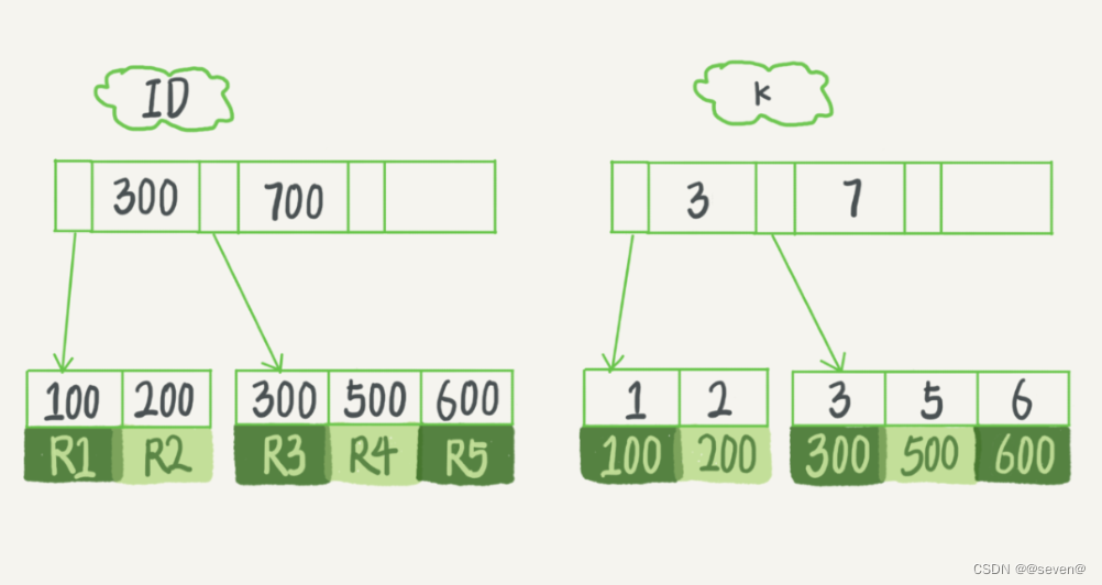 1. 在 k 索引树上找到 k=3 的记录,取得 ID = 300;