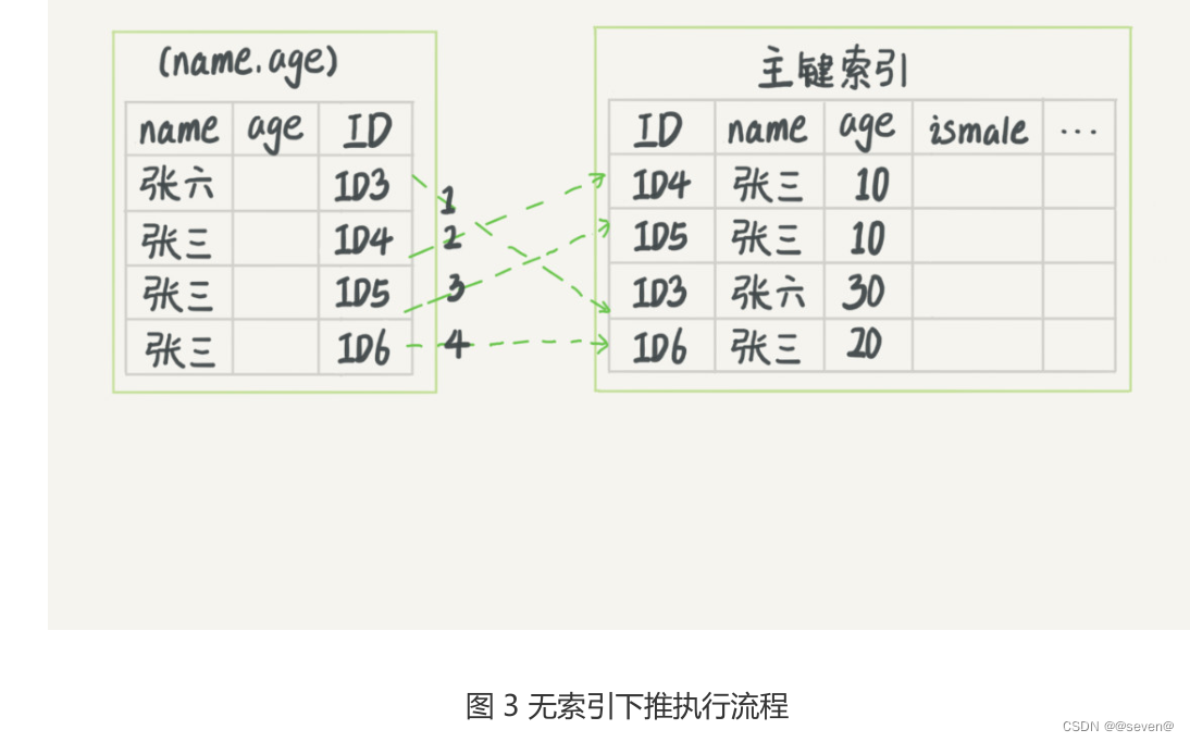 在 MySQL 5.6 之前,只能从 ID3 开始一个个回表。到主键索引上找出数据行,再对比字段