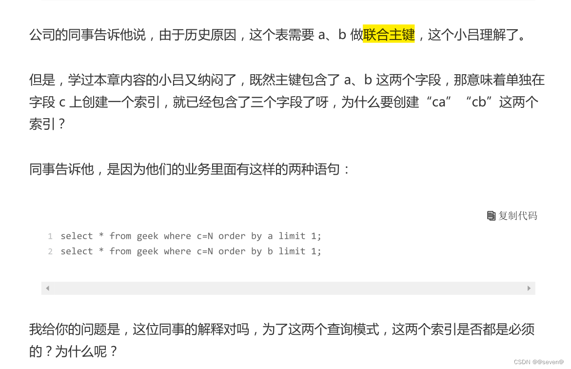 是无法使用 (a,b) 这个联合索引的,这时候你不得不维护另外一个索引,也就是说你需要同