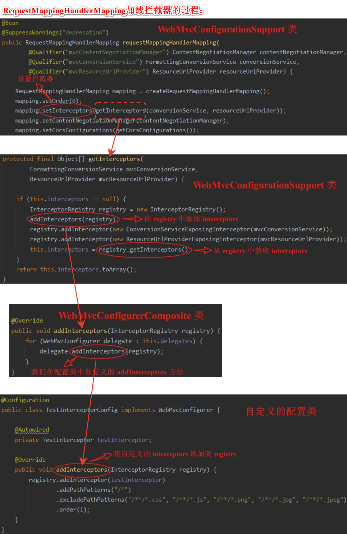此处的 “匹配当前请求的 HandlerMapping” 指的是 RequestMappingHandlerMapping,其在 WebMvcConfigurationSupport 类中完成初始化,且初始化时会加载 Interceptor,加载的过程如下图所示: