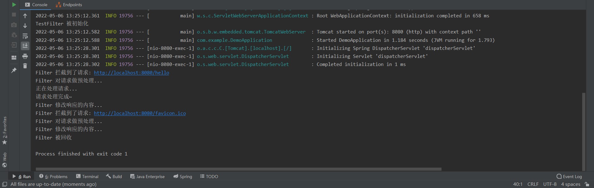 可以看到,自定义的 TestFilter 实现了拦截请求、处理响应的目标。