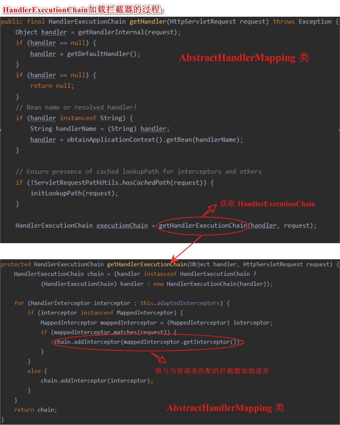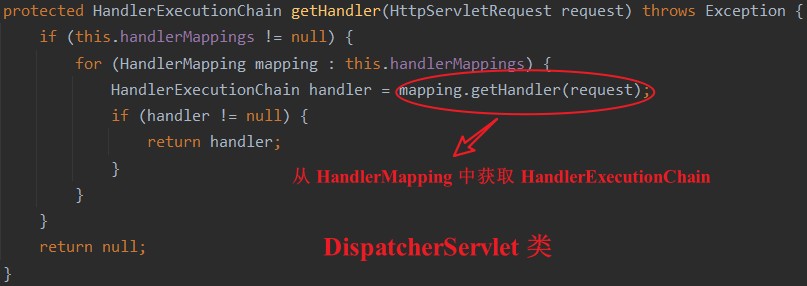 接下来我们重点分析一下 getHandler 方法(DispatcherServlet 类中定义的)背后的逻辑,看看 Interceptor 是如何加载到(或者说是封装到)HandlerExecutionChain 中的。getHandler 方法首先遍历所有的 HandlerMapping,然后找到匹配当前请求的 HandlerMapping,并调用该 HandlerMapping 的 getHandler 方法获取 HandlerExecutionChain: